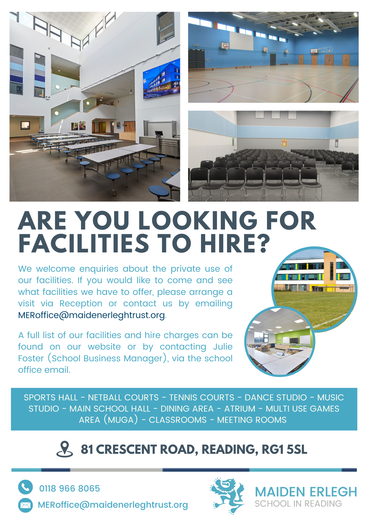 If you would like to come and see what facilities we have to offer, please arrange a visit via Reception. Alternatively, you can email Julie Foster (School Business Manager) at MERoffice@maidenerleghtrust.org.