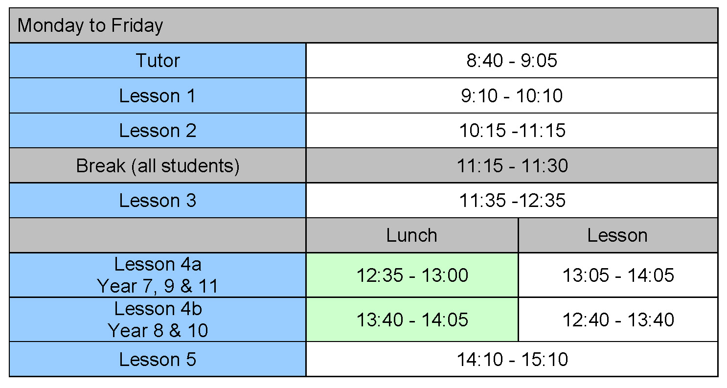 Our School day starts at 8.40 and finishes at 3.10. This equates to 32.5 school hours a week. It is a compact day which we believes aids the pace and focus of learning. Research shows that there is a direct correlation between high levels of attendance, and high levels of student attainment, therefore it is important to aim for 100% attendance each year. This achievement is rewarded and celebrated.